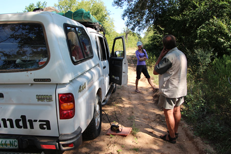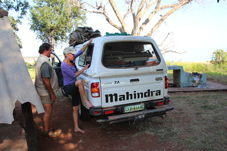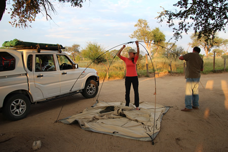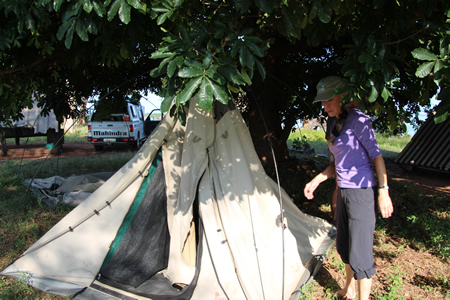 Pam Bennett-Wallberg packing camping gear in Zimbabwe.